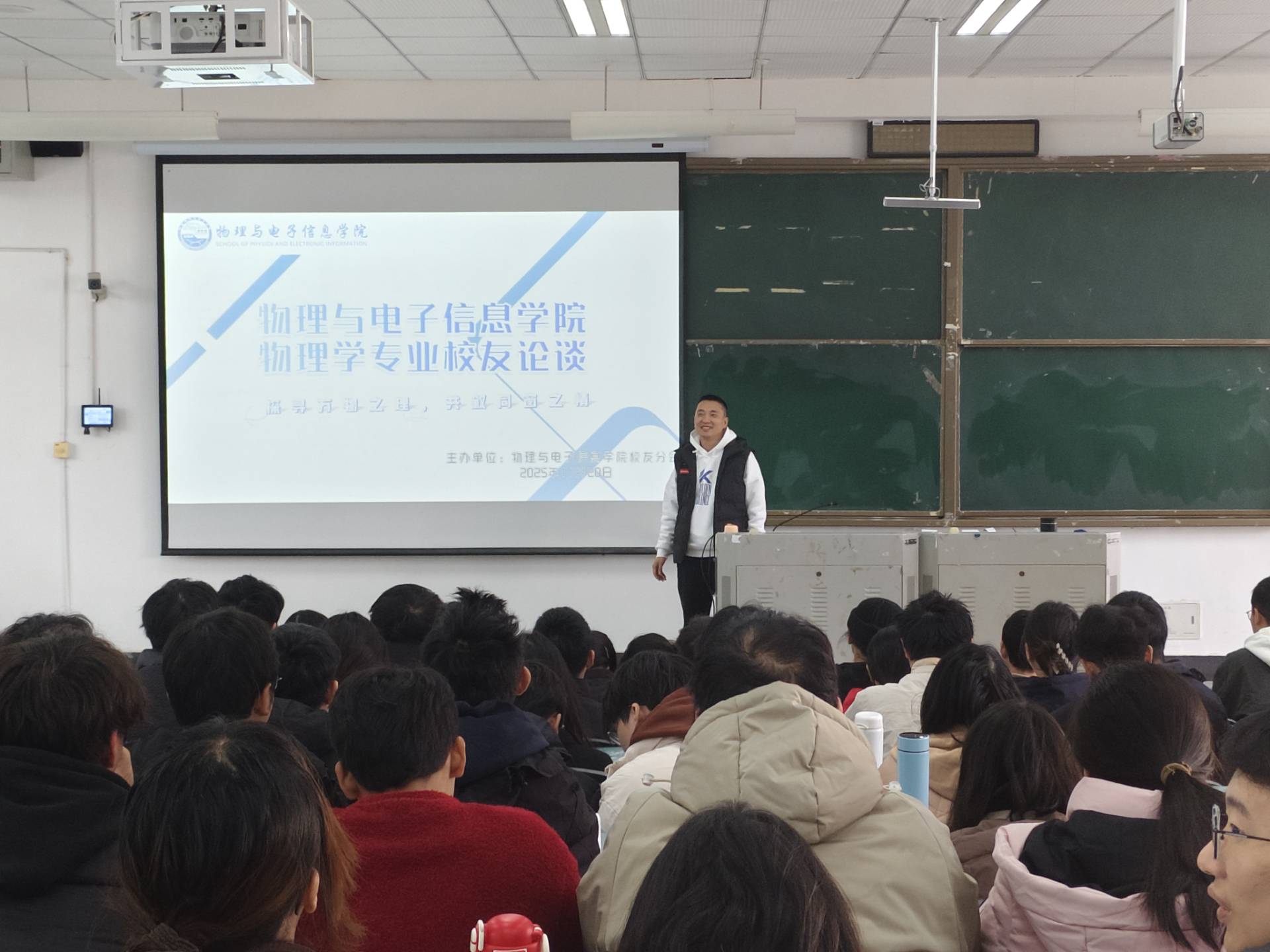 11月20日,物理与电子信息学院校友论坛在厚德楼242教室举行。物理系2005级校友、绵阳东辰中学物理高级教师连天刚老师受邀返校,以“示范课+经验分享”形式,聚焦物理师范生关切的教学实践落地与职业长远发展两大核心,和22级学生展开了深度交流。